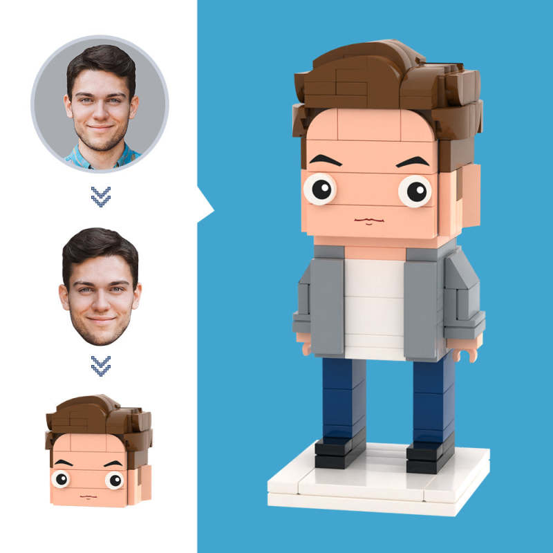 Maßgeschneiderter Kopf, lässige graue Jacke, Figuren, kleines Partikel-Block-Spielzeug, anpassbare Ziegelkunst-Geschenke