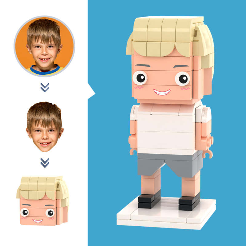 Maßgeschneiderter Kopf, Freizeitbereich, weißes T-Shirt, Figuren, kleines Partikel-Block-Spielzeug, anpassbare Ziegelkunst-Geschenke